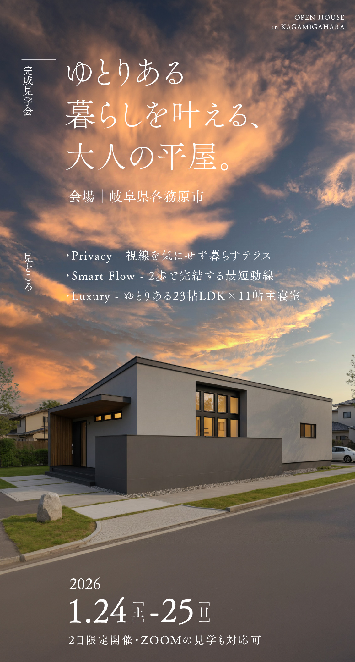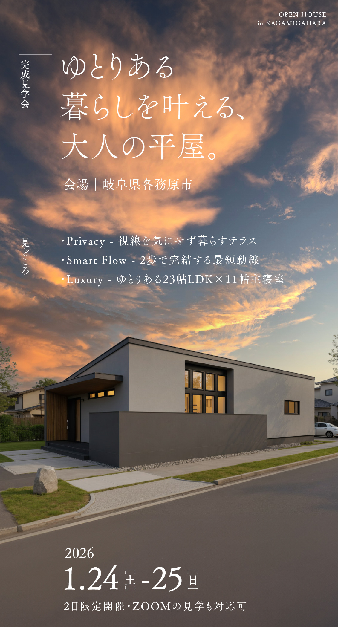 【完成見学会】1/24-25 ゆとりある暮らしを叶える、大人の平屋 in 岐阜県各務原市